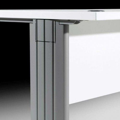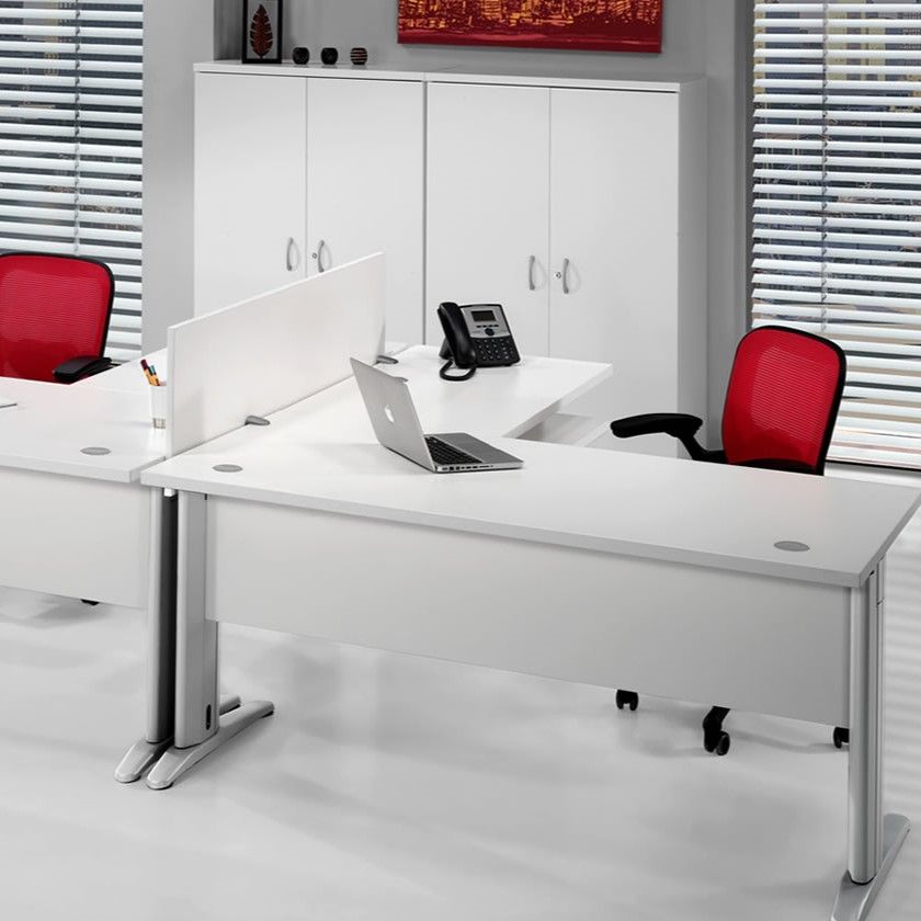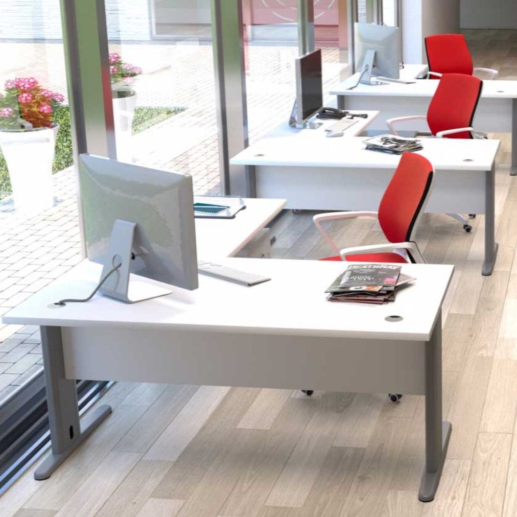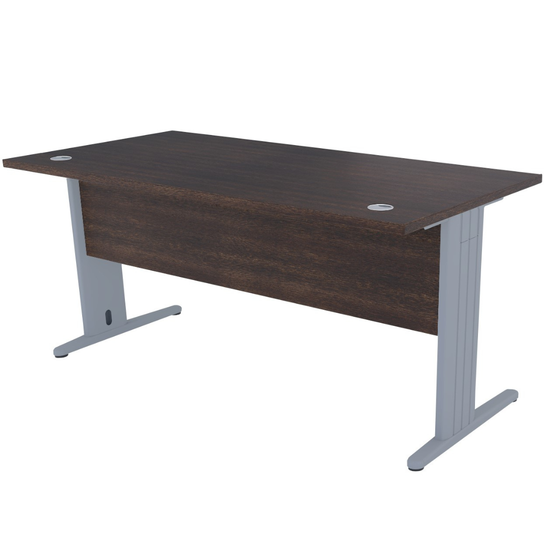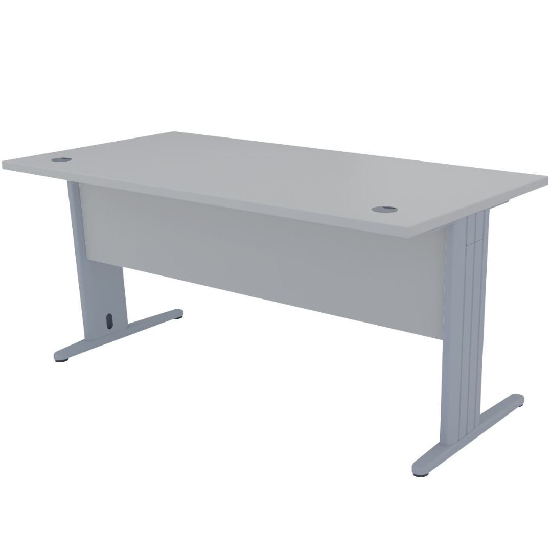 Mesa de trabajo operativa recta EURO 3000 de EUROMOF, nuestra mesa oficina NOREÑA. Formada por una tapa y dos laterales de metal en forma de "T" con reguladores en altura, con un faldón estructural de 19 mm. Tableros cubiertos lateralmente con cantos de PVC de 2 mm. Incluye 2 pasacables. Color a elegir.