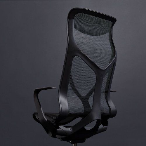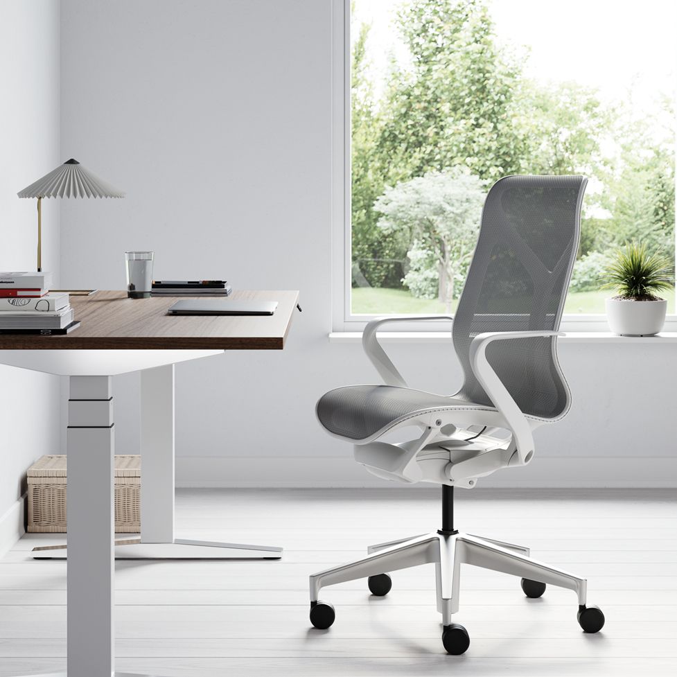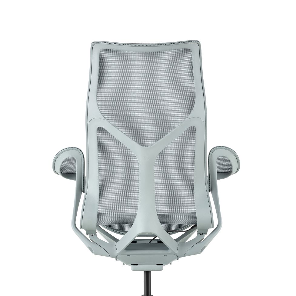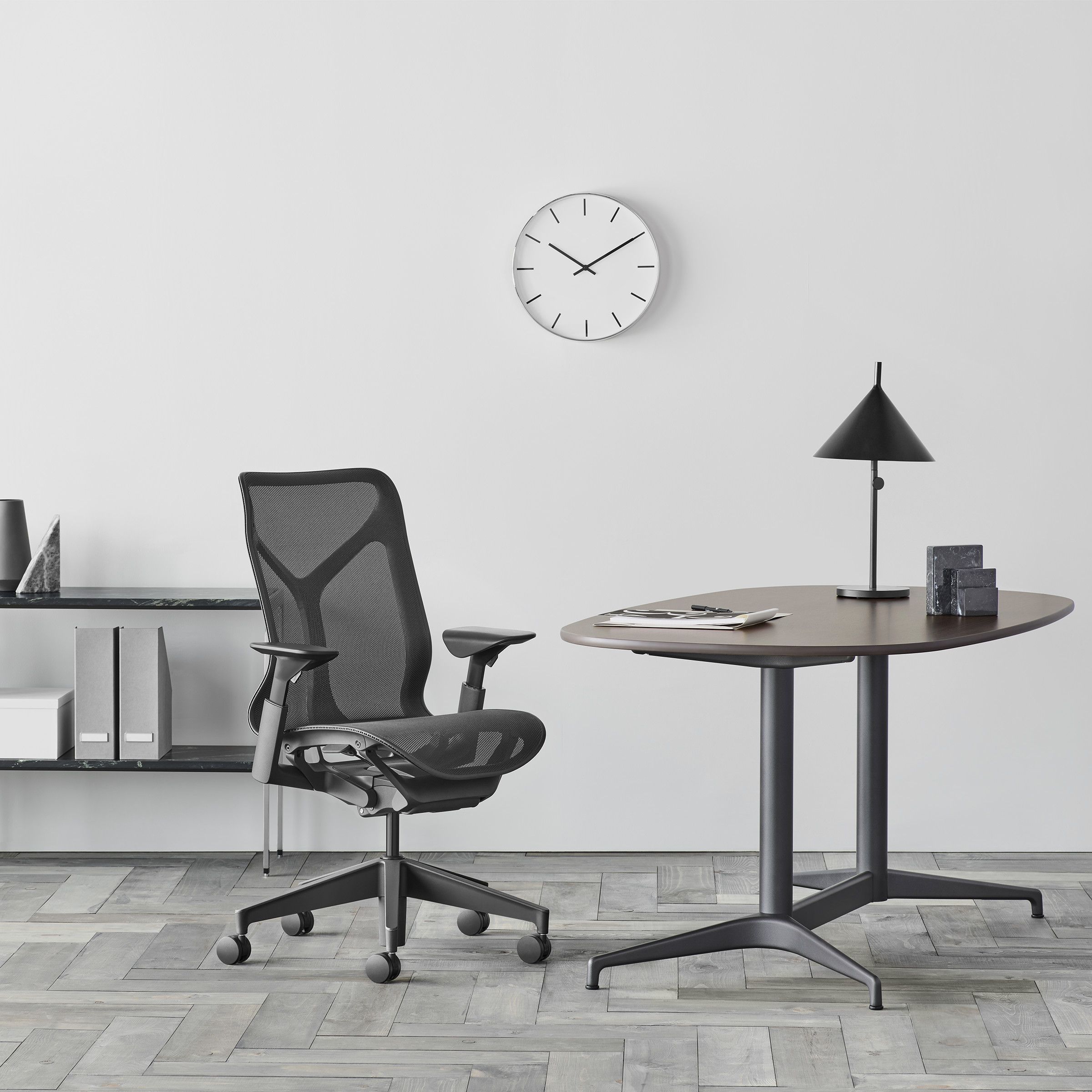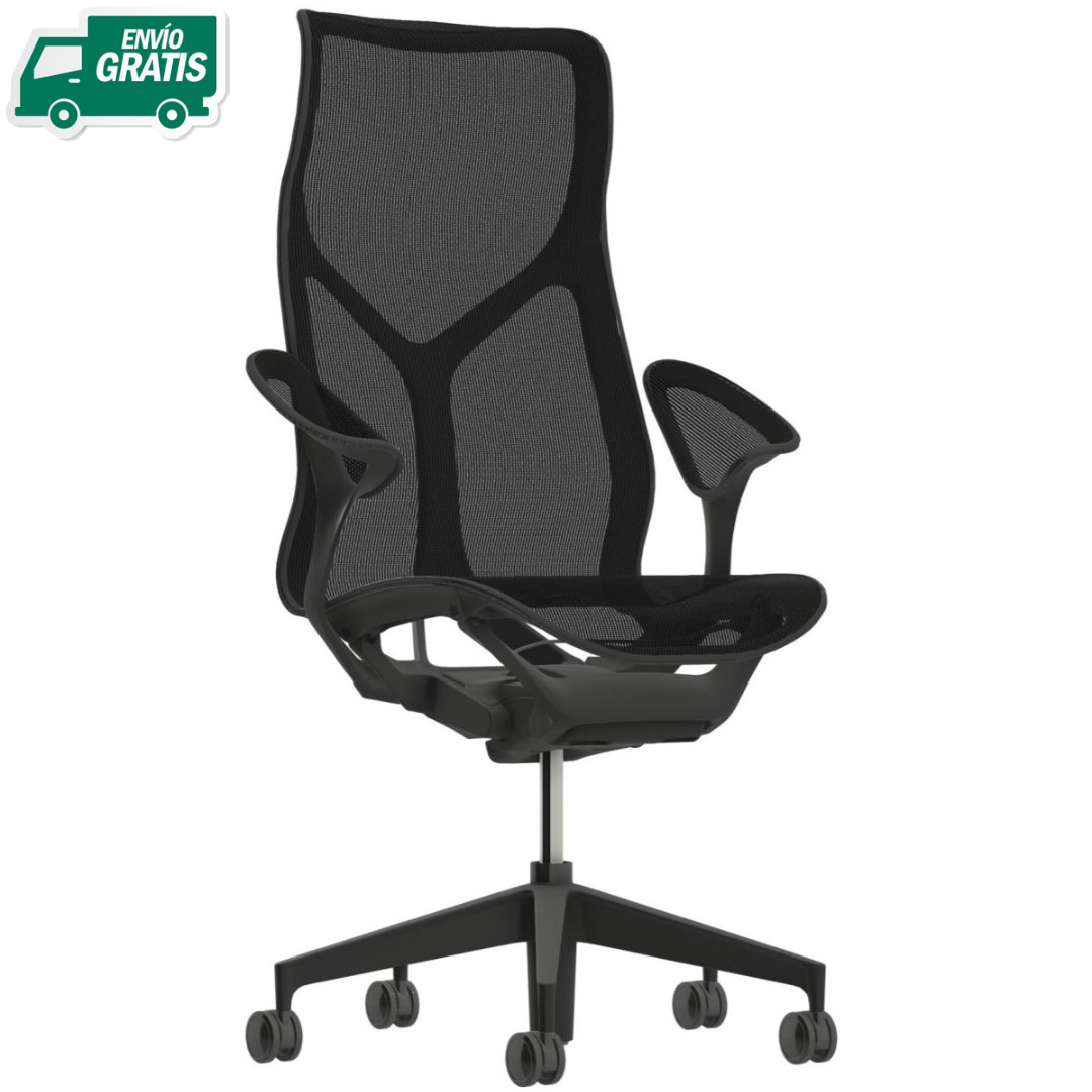 Silla de oficina trabajo ergonómica COSM alta de HERMAN MILLER, grafito. Mecanismo: Sistema sincronizado sin ningún tipo de ajuste manual con reclinación autoajustable, regulación en altura mediante pistón con gas (427-579 mm). Brazos negro, 1D - regulables en altura. Asiento y respaldo malla Intercept Suspension. Base giratoria estándar de 5 puntas con rodadura 65 mm para todo tipo de suelos (parqué, cerámico, moqueta, alfombra, etc). Color Grafito.