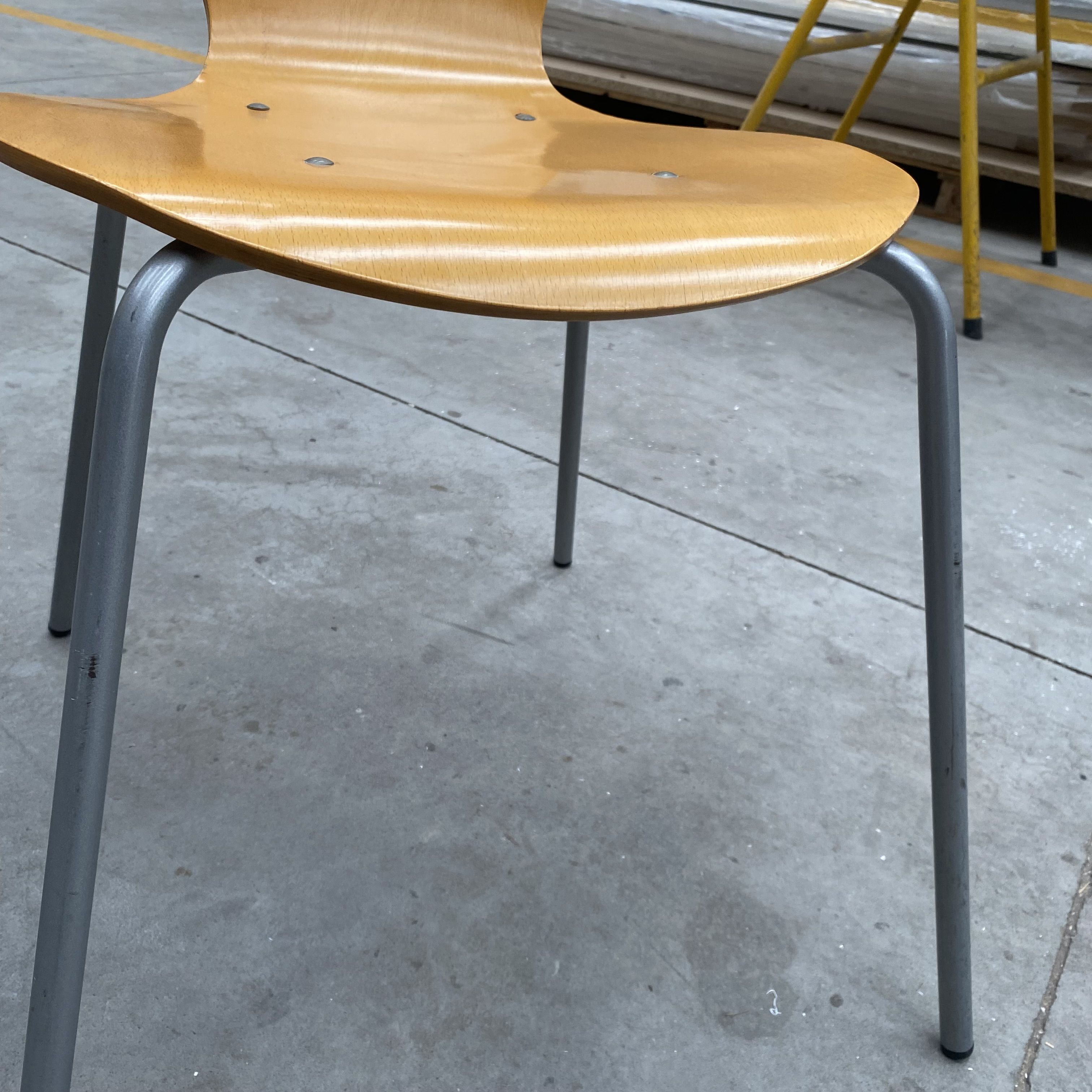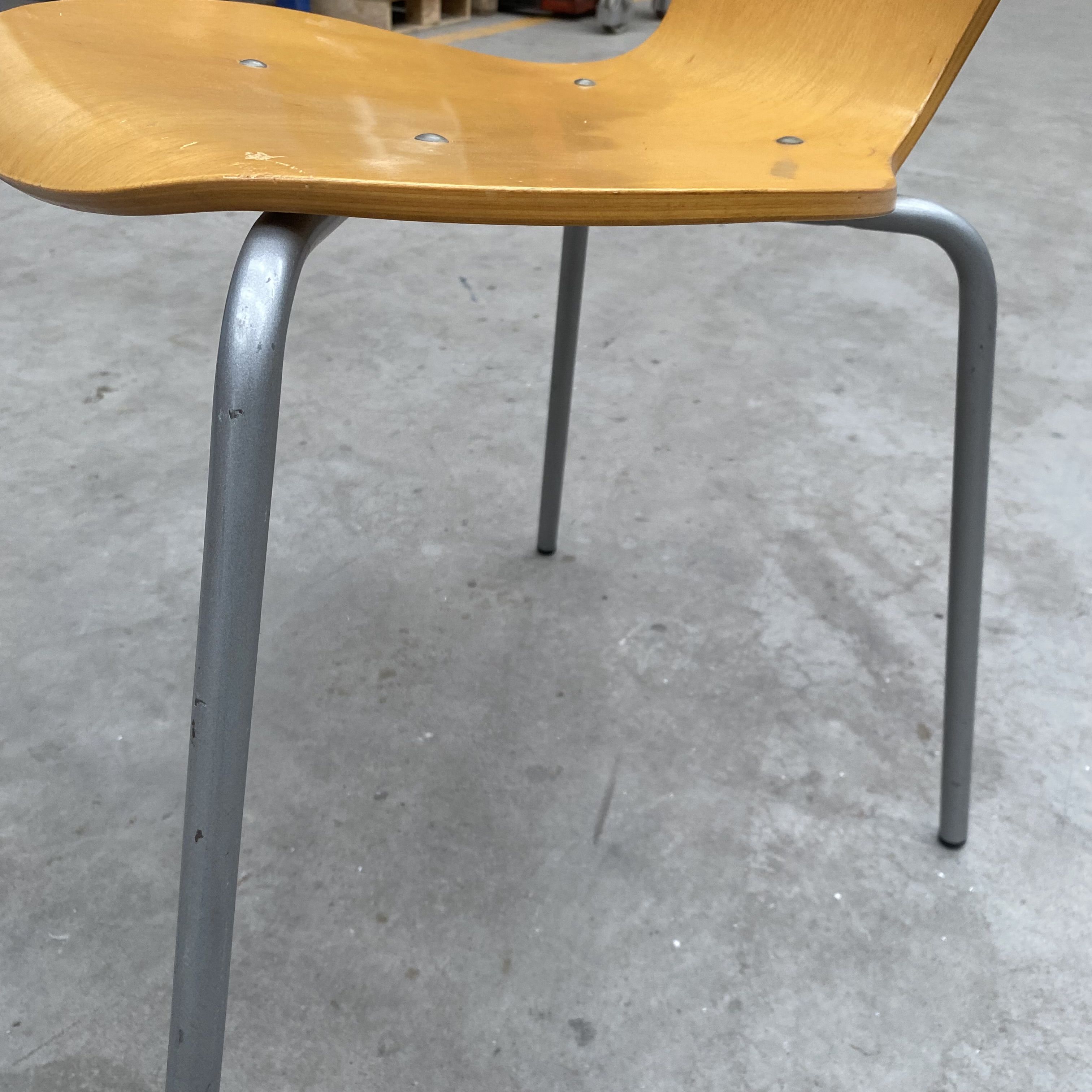 Silla fija DUBLÍN 3 de JDM ISMOBEL FORTY. Estructura metálica de 4 apoyos, fabricada con tubo y acabada con pintura epoxi. Asiento y respaldo en madera, barniz natural. Apilable.