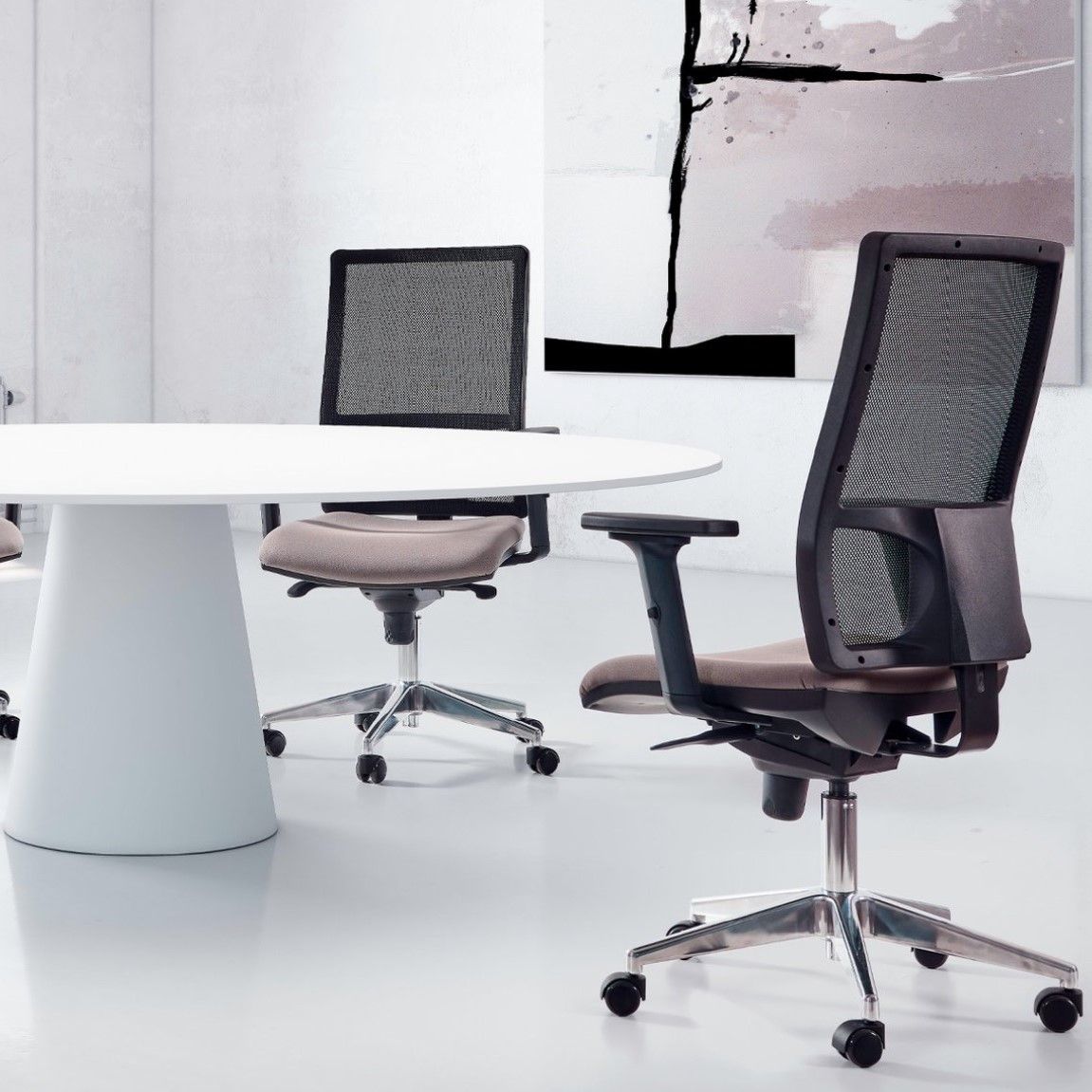 Silla de trabajo ergonómica MESH 2 de SYTA, nuestra silla oficina NAVES. Mecanismo: Sistema sincronizado de 4 posiciones entre asiento y respaldo con sistema antirretorno, respaldo regulable en altura mediante sistema de cremallera, regulación en altura mediante pistón con gas. Asiento tapizado (color a elegir) y respaldo malla (blanco, gris, rojo, morado, azul o negro). Base giratoria de nylon negro 5 puntas con rodadura blanda.