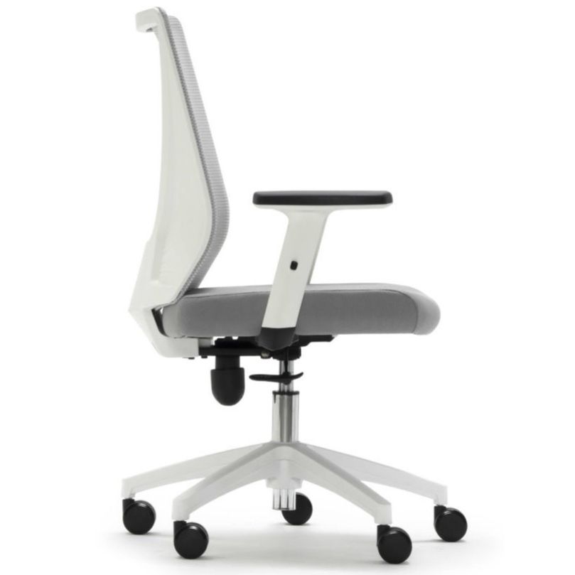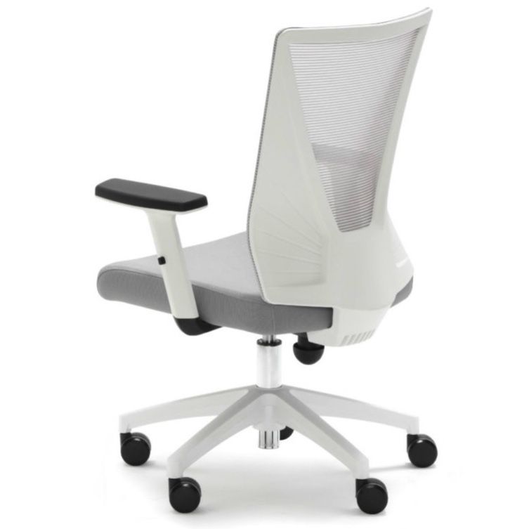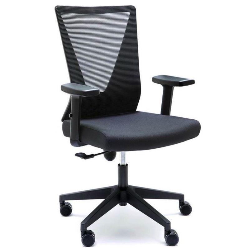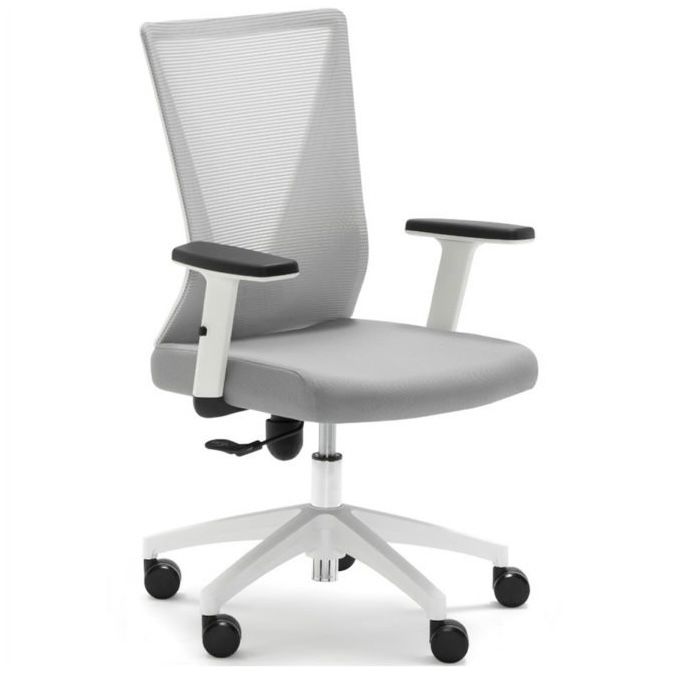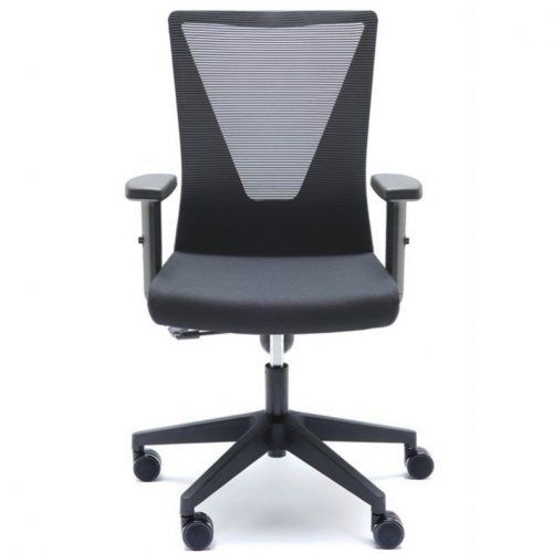 Silla de trabajo operativa TIRANA de EUROMOF, nuestra silla oficina OVIÑANA. Mecanismo: Sistema de contacto permanente liberado, tensor de presión manual, regulación en altura mediante pistón con gas. Asiento tapizado en tela flex y respaldo malla. Brazos 1D - regulable en altura. Base giratoria de nylon negro 5 puntas de 65 cm con rodadura dura. Color de tapizado y malla negro o gris.