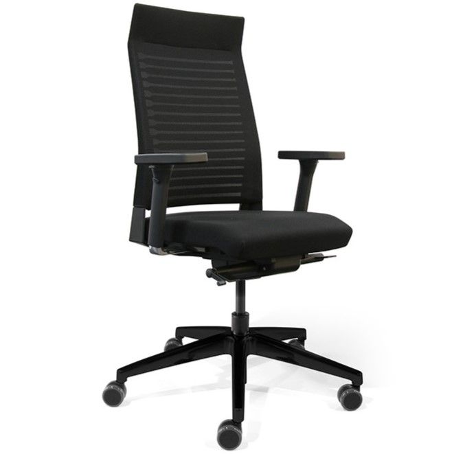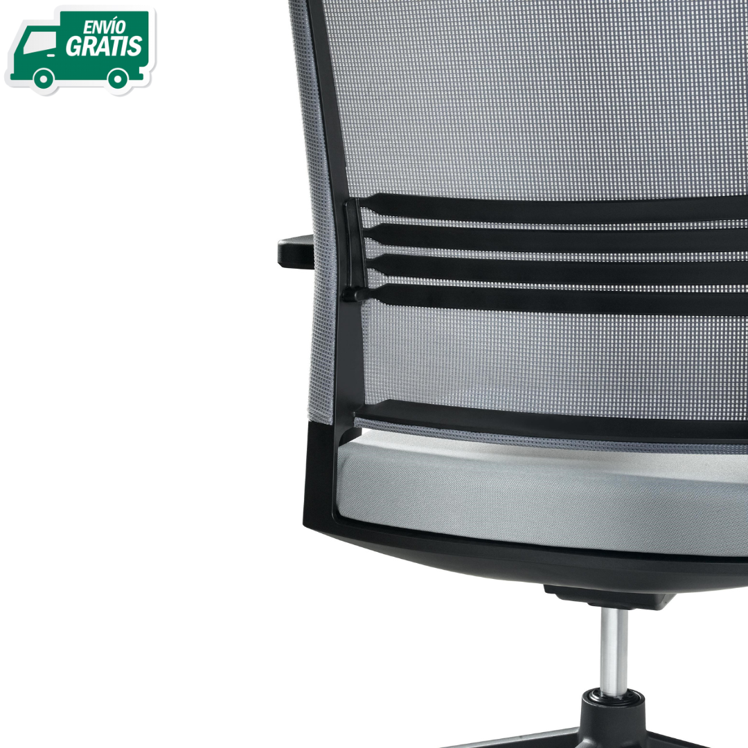 Silla de oficina trabajo ergonómica SLAT 16 de DYNAMOBEL. Mecanismo: Sistema sincronizado entre asiento y respaldo, soporte lumbar regulable (4 lamas en malla y 16 lamas en tapizado "Colección 60"), regulación de asiento en profundidad y en altura mediante pistón con gas. Asiento tapizado (color a elegir) y respaldo malla (color negro). Base giratoria de nylon negro 5 puntas con rodadura dura ø60 mm.
