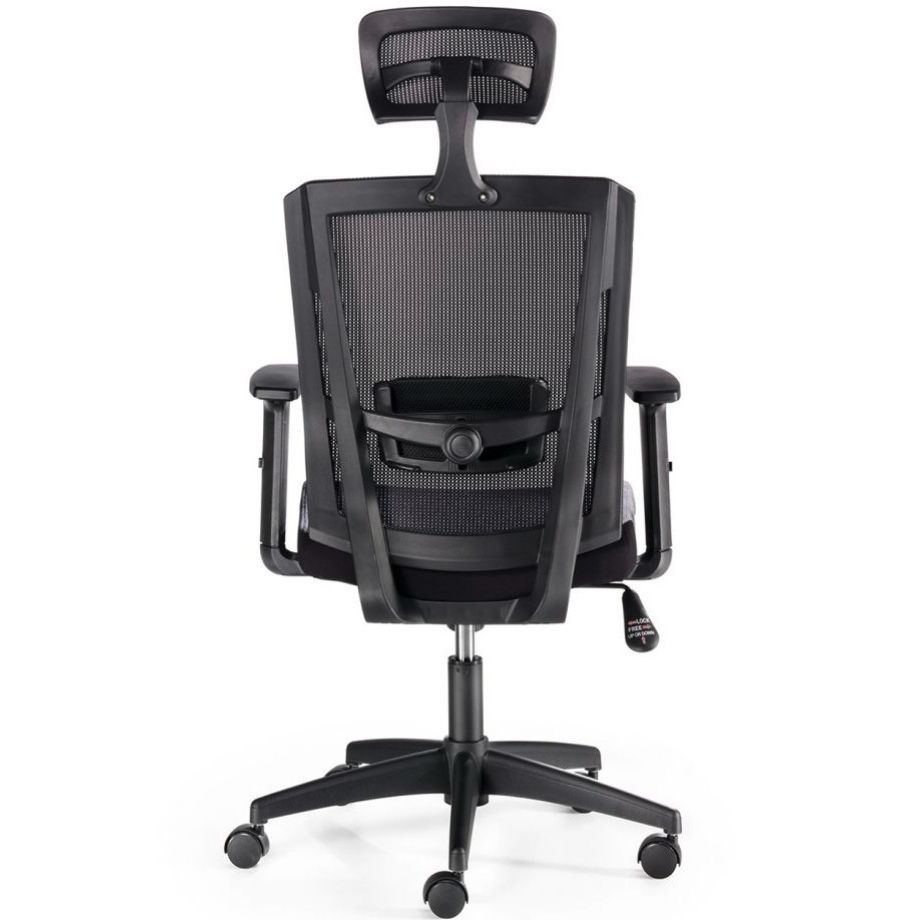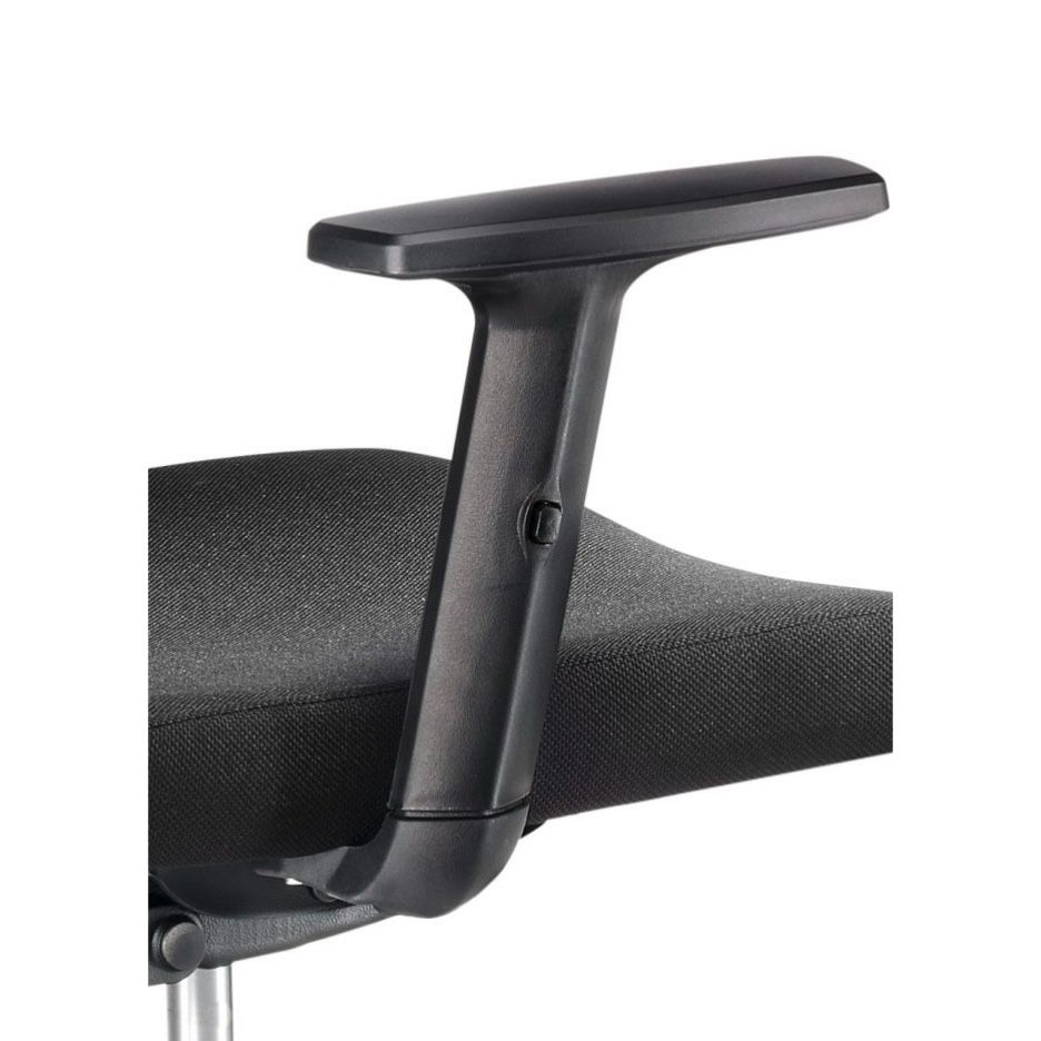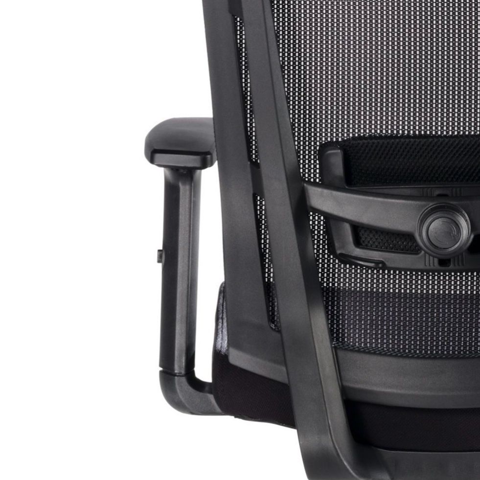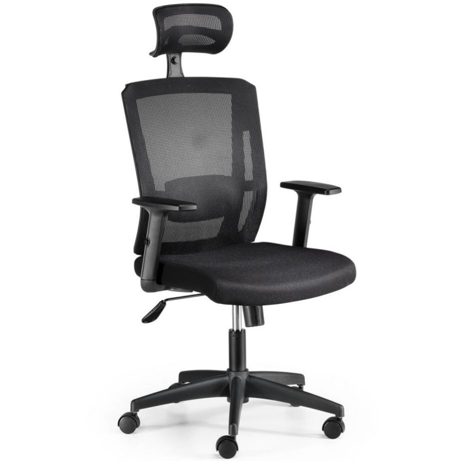 Silla de trabajo operativa SOFIA de EUROMOF, nuestra silla oficina SOMIÓ. Mecanismo: Sistema basculante, soporte lumbar acolchado regulable en altura y profundidad, tensor de presión manual, regulación en altura mediante pistón con gas. Asiento tapizado en tela flex y respaldo malla. Cabecero regulable en altura e inclinación. Brazos 1D - regulable en altura. Base giratoria de nylon negro 5 puntas de 65 cm con rodadura dura. Color de tapizado y malla negro.