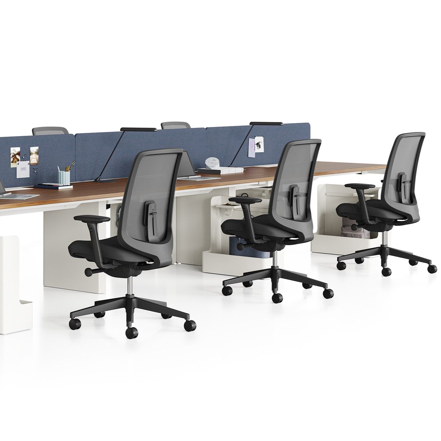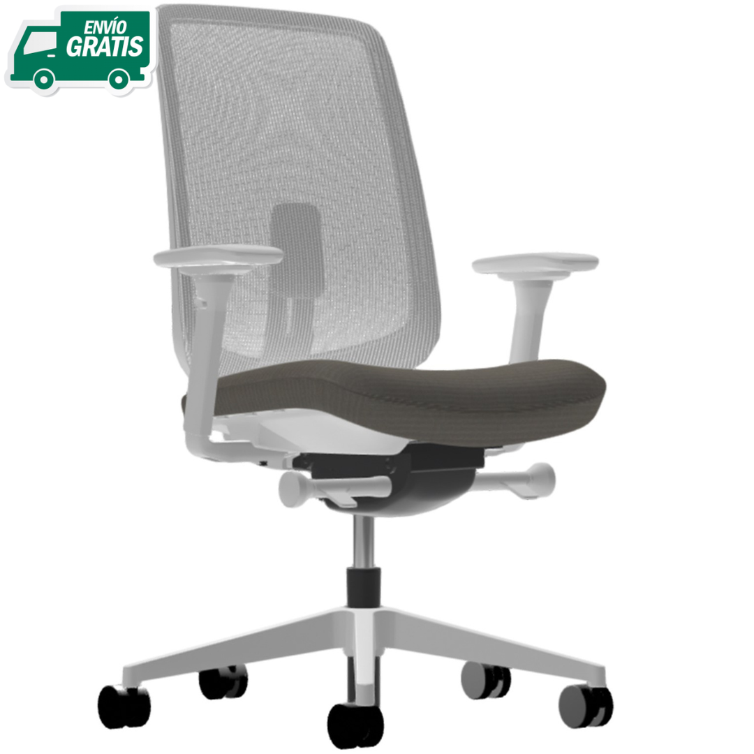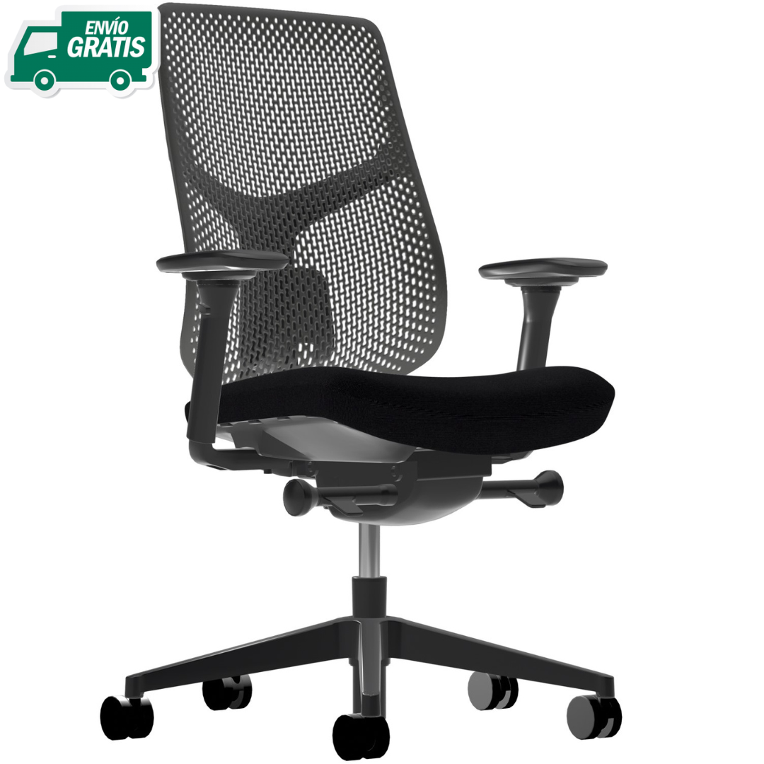 Silla de oficina trabajo ergonómica VERUS de HERMAN MILLER, negro. Mecanismo: Sistema sincronizado con limitador de la reclinación e inclinación negativa, regulación en altura mediante pistón con gas (401-528 mm), asiento ajustable en profundidad y soporte lumbar ajustable. Brazos negro, totalmente ajustables. Asiento tapizado y respaldo polipropileno Triflex. Tejido negro (en opción negro) o Phoenix Blizzard (en opción gris). Base giratoria estándar de 5 puntas con rodadura 65 mm para todo tipo de suelos (parqué, cerámico, moqueta, alfombra, etc). Color Negro + Dark Carbón "respaldo" (en opción negro) o Mineral + Blanco "respaldo" (en opción gris).