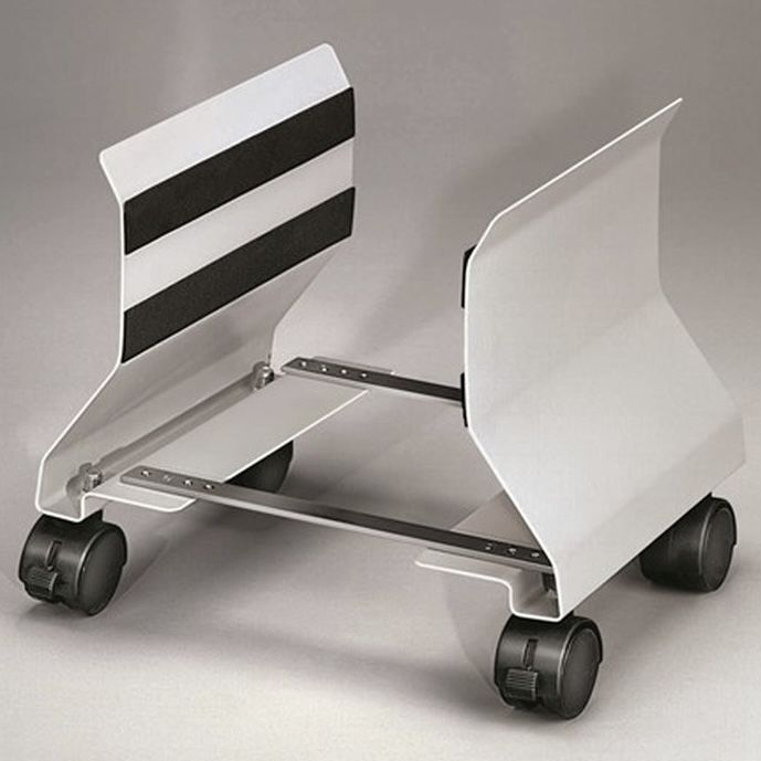 Soporte para CPU con ruedas FELLOWES. Fabricado en acero con revestimiento interior protector acolchado. Incluye 4 ruedas para facilitar el movimiento y limpieza (2 de ellas cn bloqueo para mayor estabilidad). Permite un ajuste del ancho en 76 mm (152-228 mm). Color plata.